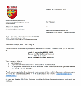 La séance du conseil communautaire se tiendra le lundi 29 septembre 2025 à 18h à la salle Espace des libertés / Gérard Saumade à Villeneuve -lès+Béziers